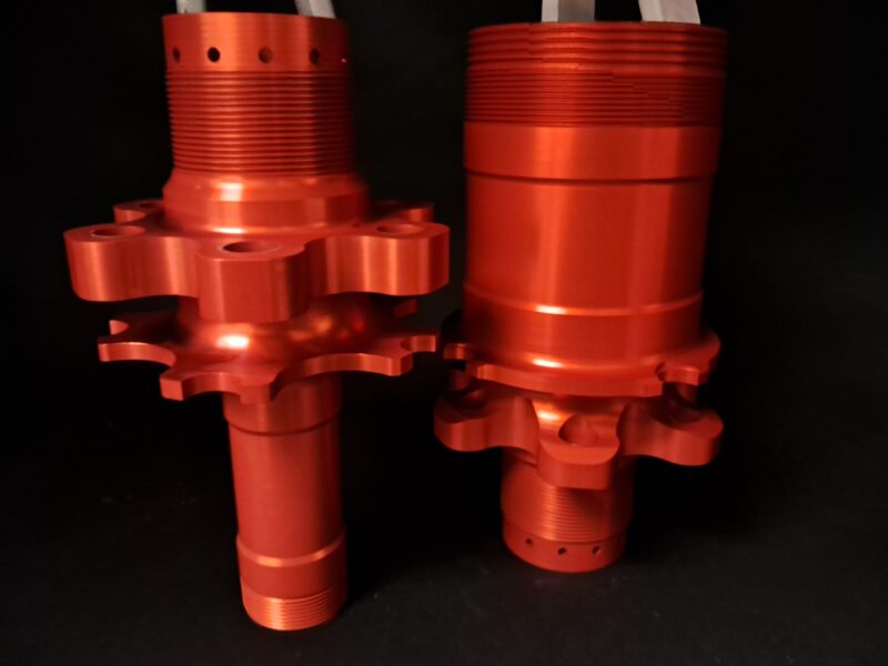The parts that Hard Anodising Surface Treatments Ltd anodised are hard to see as they are holding the wheels on the car. The anodic films tend to be hard optimised for mechanical wear and while also retaining fatigue strength. The aluminium components are less than half a kilo, and they are the type that can be held in one hand. As you can see in the images below, the parts in the photo in red make up the axle. Cardiff Racing requested them colour coded; therefore, the left side was dyed green.